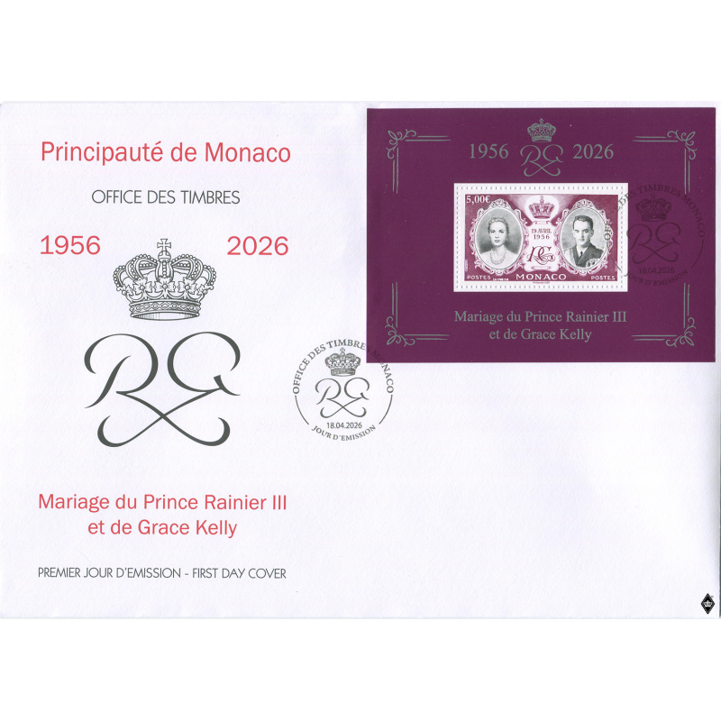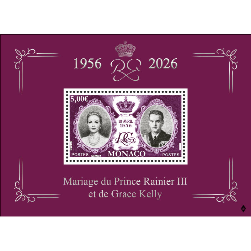 A l’occasion du 70e anniversaire du mariage du Prince Rainier II et de Grace Kelly, ce bloc reprend le visuel de la série de timbres édités en 1956.